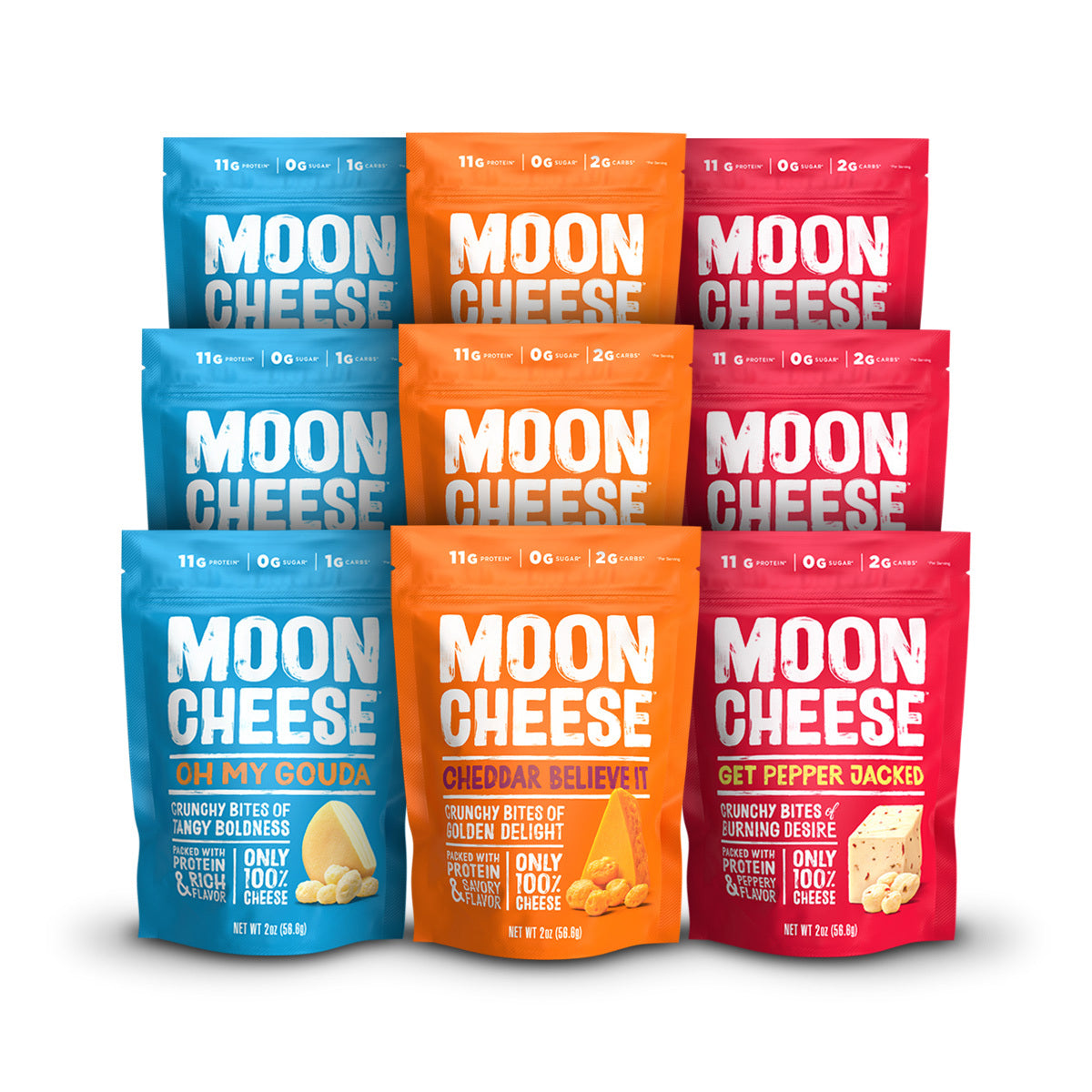 Enjoy this tantalizing trio of Moon Cheese favorites. Made with 100% cheese, they’re rich, savory, and packed with protein to give you a delicious boost of energy whenever you need it.